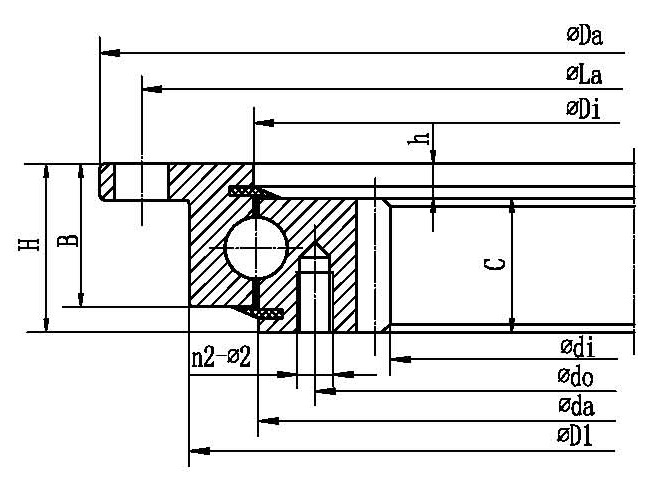 | INA 型號(hào) | Rothe Erde 型號(hào) | TG 型號(hào) | 外形尺寸(mm) | 安裝尺寸(mm) | 結(jié)構(gòu)尺寸(mm) | 齒參數(shù)(mm) | 額定軸向靜負(fù)荷(KN) | 重量(KG) | | Da | D | di | H | La | Li | n1 | n2 | φ1 | φ2 | D1 | d | b | h | B | C | Di | da | m | z | do | x |