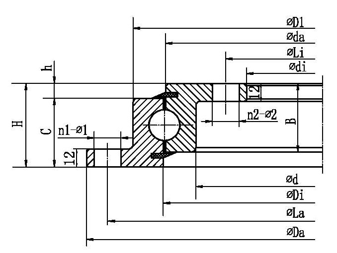 | INA 型號(hào) | Rothe Erde 型號(hào) | TG 型號(hào) | 外形尺寸(mm) | 安裝尺寸(mm) | 結(jié)構(gòu)尺寸(mm) | 齒參數(shù)(mm) | 額定軸向靜負(fù)荷(KN) | 重量(KG) | | Da | D | di | H | La | Li | n1 | n2 | φ1 | φ2 | D1 | d | b | h | B | C | Di | da | m | z | do | x |