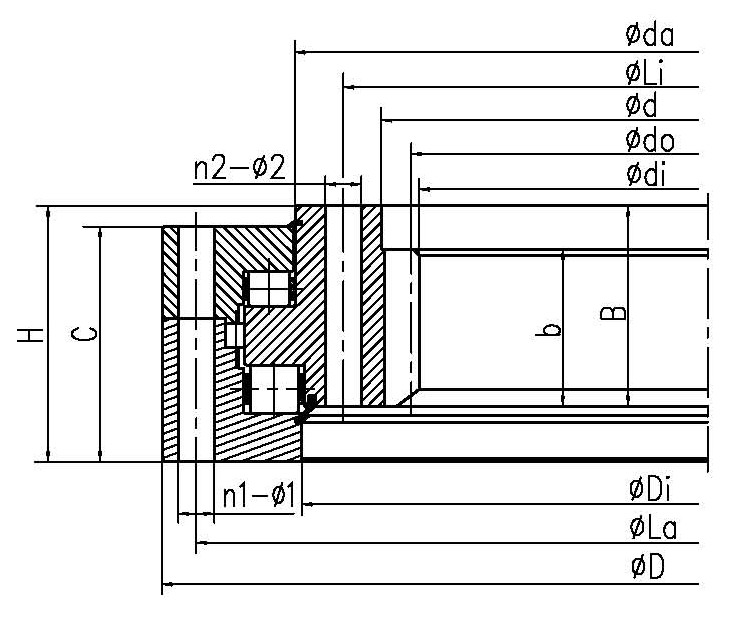 | INA 型號(hào) | LYC 型號(hào) | TG 型號(hào) | 外形尺寸(mm) | 安裝尺寸(mm) | 結(jié)構(gòu)尺寸(mm) | 齒參數(shù)(mm) | 額定軸向靜負(fù)荷(KN) | 重量(KG) | | Da | D | di | H | La | Li | n1 | n2 | φ1 | φ2 | D1 | d | b | h | B | C | Di | da | m | z | do | x |