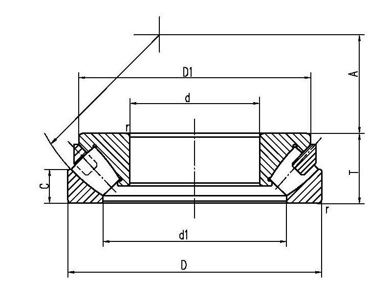 | 外形尺寸(mm) | 基本負(fù)荷(KN) | 極限轉(zhuǎn)速(r/min) | 重量(KG) | | d | d1min | D | D1max | T | B | C | A | rsmin | 動(dòng) | 靜 | Old_spec | Designations |